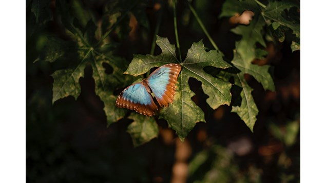 Den er smuk, eksotisk og ikke mindst langt større end man lige regner med. En Blå Morpho sommerfugl havde heldet med sig, da den fredag d. 9. juli formåede at flygte ud gennem et ovenlysvindue fra Randers Regnskov. Med et vingefang på hele 20 cm og en iøjnefaldende smuk blå farve, så har den uden tvivl kunne imponere forbigående på Gudenåstierne.