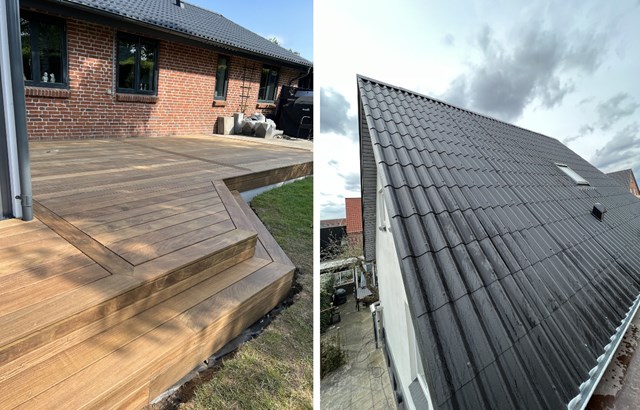 LPE terrasse til venstre og et helt nyt tag med B7-tagplader (Foto: Brdr. Sand)