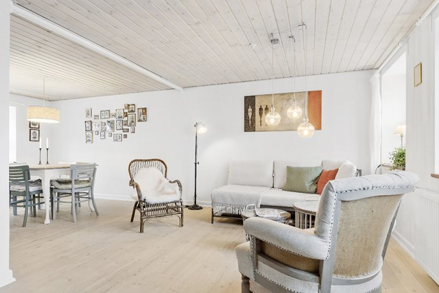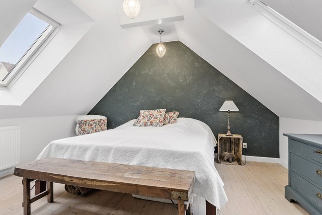 På 1. salen finder en god repos, som leder videre til de i alt tre værelse – alle med lofterne ført i kip.