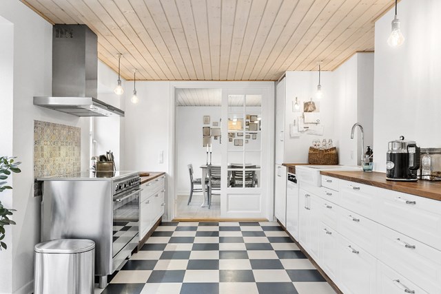 Vi ledes videre til ét af husets absolutte højdepunkter; nemlig det store åbne køkken-alrum. Et fantastisk rum med masser af luft og plads. Køkkenet er tidligere udskiftet og fremstår utrolig pænt og i en stil, som passer perfekt til husets charme.