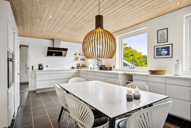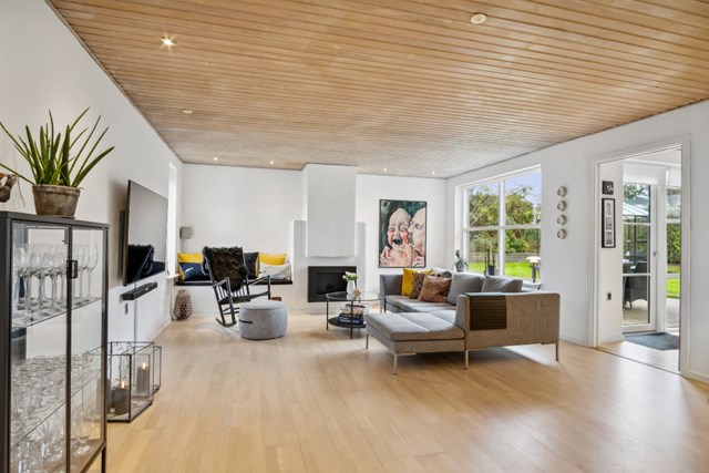 Fra bryggers kommer du videre ind i det åbne, lyse og moderne HTH køkken fra 2016. Her er masser af plads til at udfolde sine kulinariske madevner. Køkkenet giver mulighed for at arrangere spisepladsen og åbner op til den hyggelige stue, hvor der er plads til afslapning foran bio pejsen.
