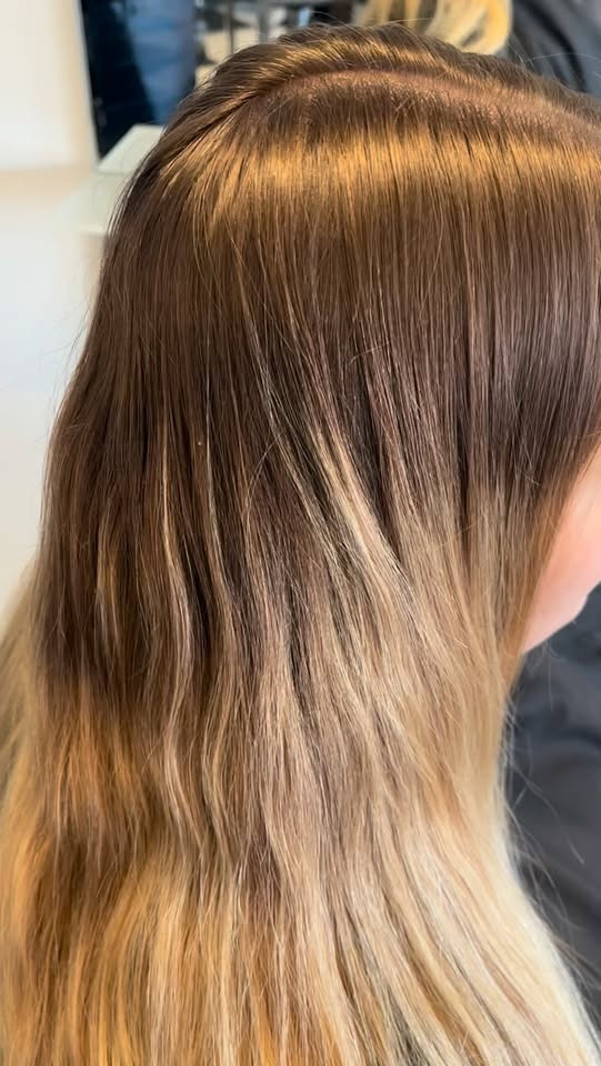 Hun ville gerne væk fra de gyldne toner og den mørke bund. Vi har lavet vores populære Chlou signaturblond som bliver lys og klar, men samtidig med en blød udvoksning for længst mulig holdbarhed
