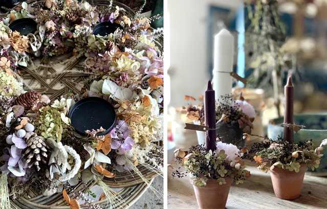 "Det vi laver mest til advent, er hortensiakranse sammen med andre tørrede blomster og græsser. De er eventyrlig smukke, og så er de ligeså smukke juleaften. I det hele taget, bruger vi meget de tørrede ting, hvis det er noget, der skal holde sig flot længe," lyder det fra Lonnie.