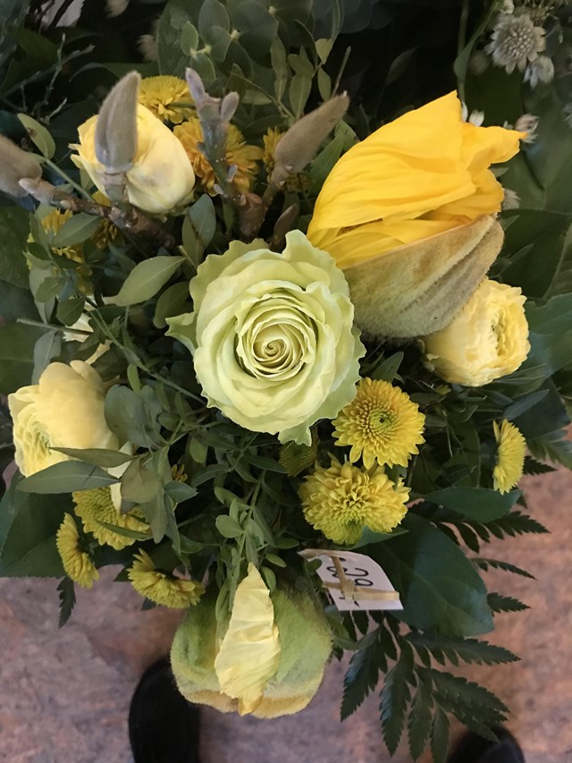 Roser, Santini, Chrysantemum, Papaver og Ranunkler er en del af denne overdådige buket fra Den Pink Tulipan. Foto: Privat.