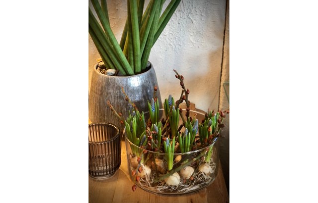 Perlehyacinter gør sig godt med grene i en glasvase. Orkideen hvis grønne stængler lige kan skimtes bag hyacinterne hedder cybidium, og den er en hemmelighed, der kun kan ses i fuldt flor ved et besøg i selve butikken. Foto: Privat.