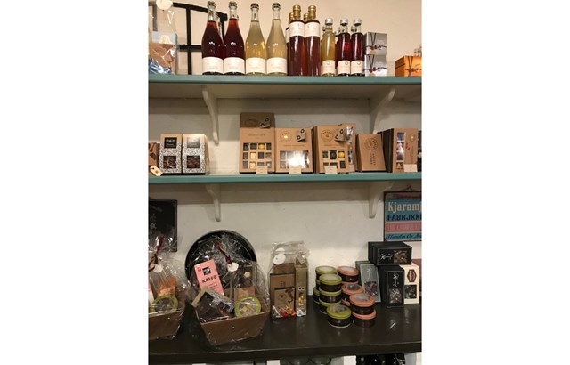 Hylderne med gaveæsker i Den Pink Tulipan bugner af lækkerier, blandt andet den lækre Anker-Chokolade. Foto: Privat.