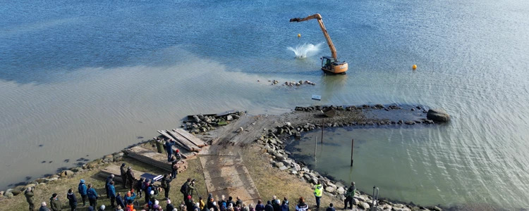 Naturgenopretning: Onsdag 15. marts gik arbejdet i gang med at kaste store sten i fjorden ved Udbyhøj. Den store mængde sten bliver til fire nye stenrev, så fjordens dyre- og planteliv igen kan trives.