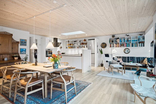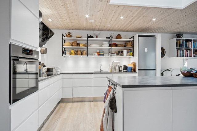 Her er masser af plads til både madlavning og socialt samvær, og det åbne layout skaber en indbydende atmosfære. Ovenlysvinduet over køkkenøen sikre et dejligt lysindfald igennem dagen.