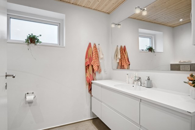 Fra stuen er der også adgang til en mindre mellemgang som er adgangsgivende til endnu et værelse, også med indbyggede skabe, samt et linnedskab til opbevaring. Til sidst leder mellemgangen også videre til husets flotte badeværelse. Her findes et veludstyret badeværelse i samme lyse stil som resten af huset, som fuldender boligen med en rummelig brusekabine og væghængt toilet.