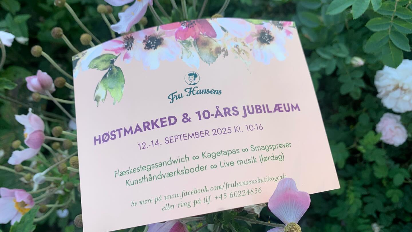 Det er nu et årti siden, at Fru Hansens Butik & Café åbnede dørene for første gang, og det fejres med et brag! Fra fredag den 12. september til søndag den 14. september kan besøgende glæde sig til en weekend fyldt med smagsoplevelser, kunst og musik.