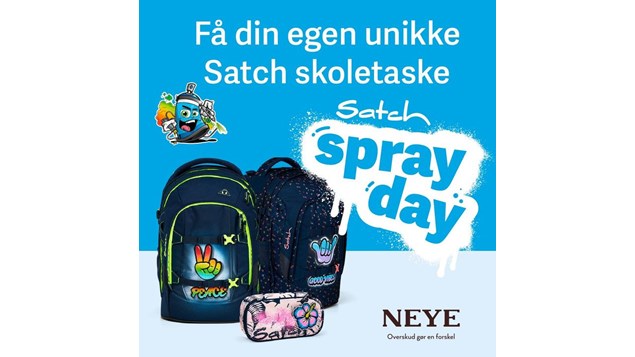 SATCH Spray Day i NEYE Onsdag, d. 29. maj kl. 14-18 går det løs! Denne dag kan du få dekoreret din Satch skoletaske eller penalhus med et sejt motiv - helt gratis Hvis du ikke allerede er den heldige ejer af et Satch produkt, har du mulighed for at købe det i butikken på dagen.