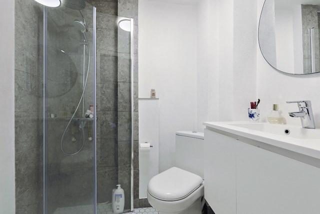 Til sidst har vi det lyse moderniserede badeværelse med ny bruseniche samt håndvask med nyt skabsarrangement. Alle armaturer er super flotte og i stilrene materialer.