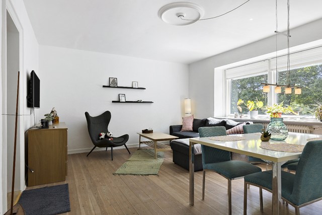 Bevæger vi os videre ind i lejligheden finder vi den hyggelige kombinerede spise-dagligstue – igen med flotte plankegulve, lyse lofter med stue samt udsigt til parken på den anden side af vejen.