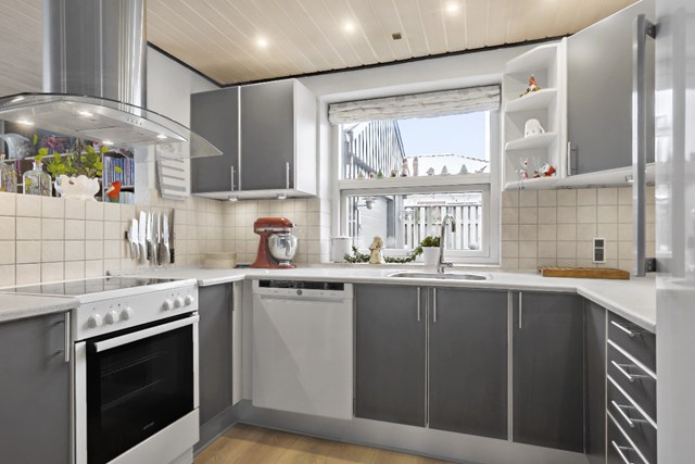 Her er god plads til både sofahjørne, og at hele familien kan samles om et langt spisebord. I forlængelse af stuen er et funktionelt køkken. Huset her byder endvidere på endnu et godt og regulært værelse, samt et super bryggers med plads til vaskefaciliteter.
