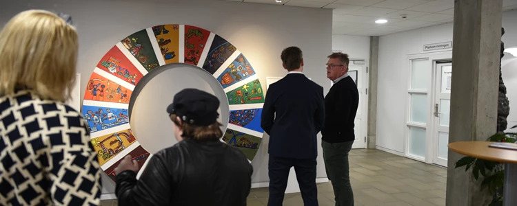 Selvom det 2,5 x 2,5 meter cirkelformede maleri nu har fået ny ejer, bliver det stående i forhallen på Laksetorvet hos Randers Kommune. Herfra overvejer Maria at udlåne det til forskellige formål, for eksempel festivaler, for at gøre opmærksom på budskaberne i de 17 verdensmål.