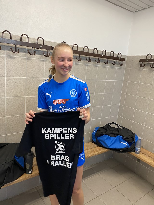 Andrea Madsen med 'Kampens spiller'-trøjen (Foto: Jimmi Grønkjær)