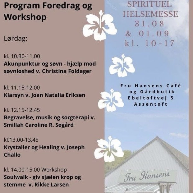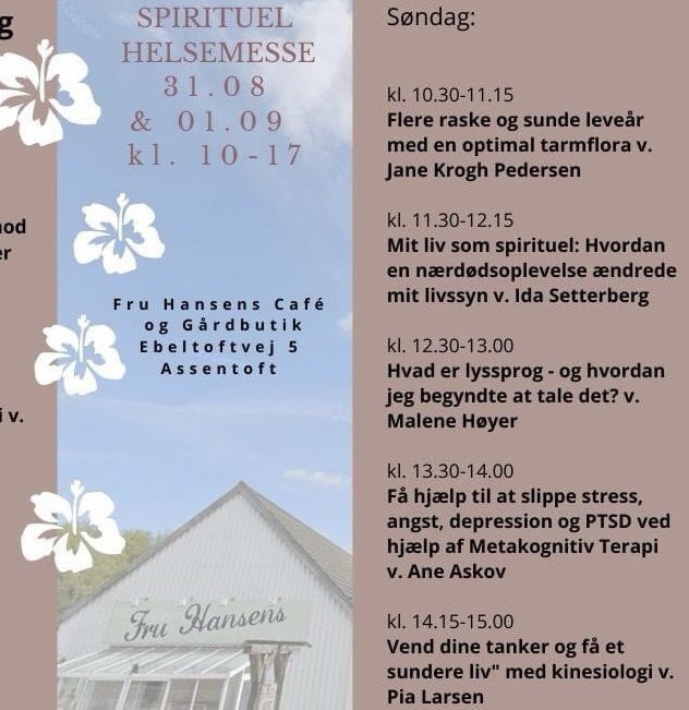 Som noget helt nyt afholder Fru Hansens Butik & Café nu en spændende, spirituel Helsemesse den kommende weekend d. 31. august og 1. september. Indehaver, Helle Hansen, har arrangeret messen i de tilstødende lokaler, der tidligere var værksted og har sørget for, at der henover begge dage vil vil være 15 stande, hvor du har rig mulighed for at prøve lidt forskellige ting udover det sædvanlige.