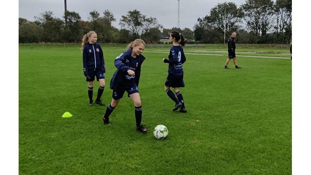 Der blev kæmpet godt i den stride vind, det var ikke nemt at få det til at se rigtig pænt ud. Ikke alt fungerede, men alle pigerne viste flot indsats, og første halvleg trak mange kræfter pga. den stormende modvind.