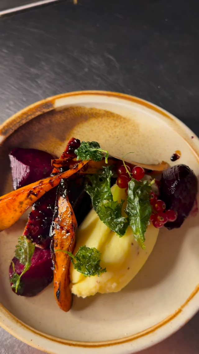 Braiseret dansk oksebryst, glaserede rødder, grønkål, cremet kartoffelmos og trøffelsauce