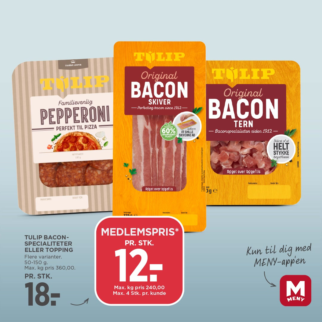 Det kan også betale sig at være medlem af MENY-appen, hvis du har en tidlig julefrokost i kalenderen. I denne uge kan du bl.a. få Gestus røget laks i skiver til 35 kr. eller Tulip Bacon til 12 kr.