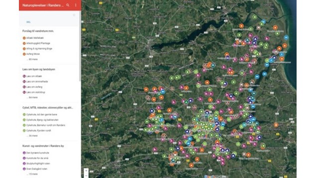Randers Kommunes kort over naturoplevelser indeholder 440 interessepunkter, hvoraf de ca. 100 er forslag til gå-, vandre- og cykelture i by og på land.
