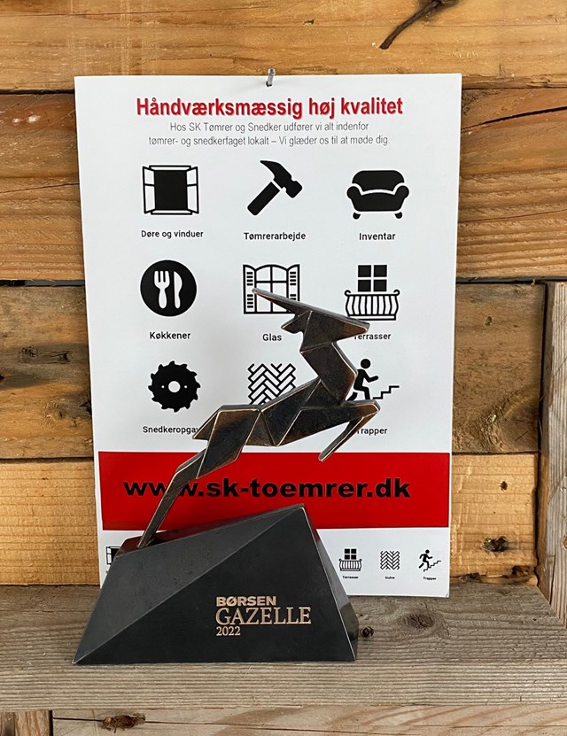 SK Tømrer & Snedker, med Søren Kaasgaard i spidsen, oplever rigtig fin vind i sejlene, og er således netop blevet tildelt Børsens Gazelle-pris. For at blive hædret med Børsens Gazellepris kræver det, at virksomheden i løbet af fire regnskabsår, hvert år har haft positiv vækst, og samlet set mindst har fordoblet omsætningen over de fire år. Det har man opnået hos SK Tømrer & Snedker
