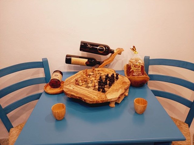 Skakspil og brikker er selvfølgelig håndlavede i oliventræ, og man kan købe et spil i butikken, hvor Teresa med tiden også har tænkt sig at importere domino- og backgammonspil i den ædle træsort.
