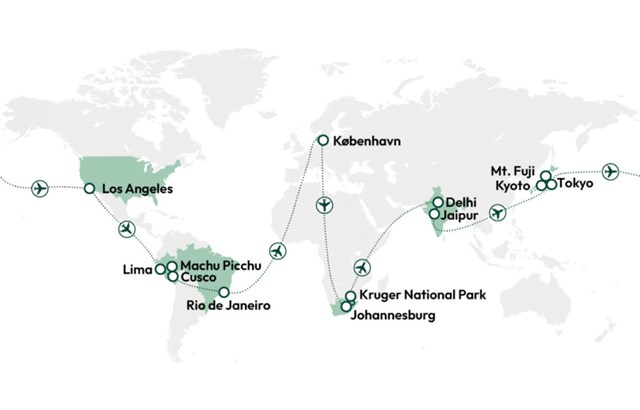 Rejsen byder bogstaveligt talt på en verden af oplevelser – med besøg i fire kontinenter og i alt seks lande. Og blandt højdepunkterne findes hele tre af verdens syv vidundere: kærlighedspaladset Taj Mahal i Indien, den glemte inkaby Machu Picchu i Peru og Kristusstatuen med udsigt over Rio de Janeiro i Brasilien. Men der venter også safari blandt savannens ”The Big Five”-dyreliv i Sydafrika, en kulturel tidsrejse gennem Japan og afslappet californisk livsstil i Los Angeles på den amerikanske vestkyst.