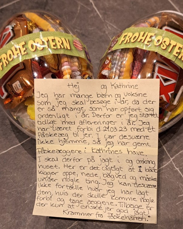 Påskeharen har lagt en seddel til Kathrine og hendes børneven, der næsten ikke kunne være i sig selv af spænding. (Foto: Privat)