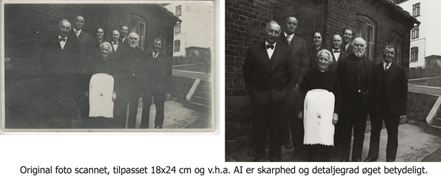 Det kan være billeder af olde- eller tipoldeforældre, fødegården eller noget helt andet. Og du bestemmer jo helt selv, hvor meget der skal gøres ved billedet. Om det bare er en 1:1 kopi, eller om der skal gøres mere. Mange synes, det er noget pjat at farvelægge, fordi man jo reelt set ikke ved, om det så sådan ud – andre synes, det giver et dejligt nyt liv til billederne. Så vi snakker om det, når du afleverer eller sender billederne.