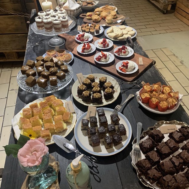 I caféen kan du forkæle dig selv med vores store ta' selv kagetapas og kaffebord for 175 kr. pr. person. Husk at bestille bord på forhånd for at sikre din plads.