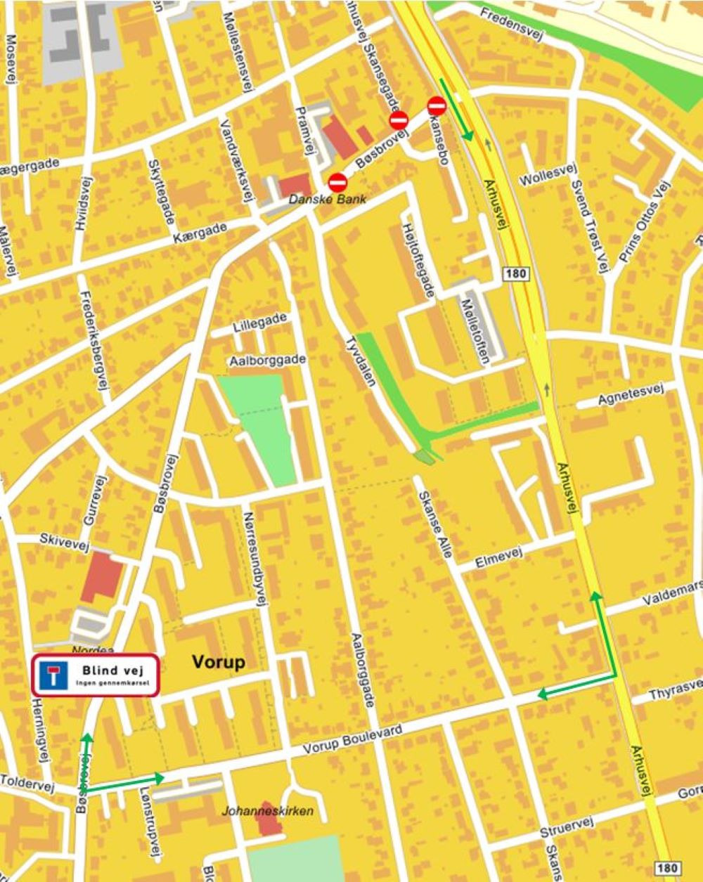 De trafikanter, der normalt vil køre til og fra Vorup ad krydset Bøsbrovej/Århusvej skal derfor ud på en omkørsel. Det er dog stadig muligt at komme til Skansegade, der er åben i den nordlige ende af gaden, mens beboere på Skansebo vil blive direkte kontaktet med information om, hvordan de skal forholde sig. Cykler og gående kan passere kloakarbejdet i hele perioden.
