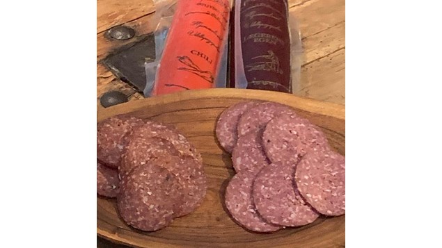 Smagsprøver på Jægerens krondyr-spegepølse hos Fru Hansens Butik og Café i morgen