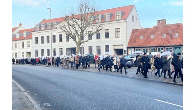 Med på gåturen var frivillige fra ReThinker Randers og flere Randers-borgere, som var mødt frem for at støtte op. Og heldigvis for det lange optog af gående kursister fra over 70 forskellige lande, var der ikke brug for de mange farvestrålende paraplyer, som de havde med på turen, for vejret på denne januardag var strålende.