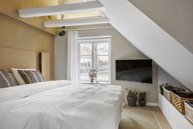En trappe fører op til førstesalen, hvor du får repos med mulighed for at indrette en hyggelig kontorarbejdsplads, et lækkert badeværelse og et soveværelse. Heroppe er det især de synlige loftsbjælker, som stjæler billedet og er med til at understrege ejendommens karakter.
