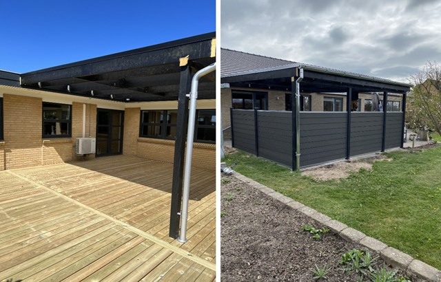 Til venstre ses en terrasse med overdækning og til højre en overdækket terrasse med komprosithegn (Foto: Privat)