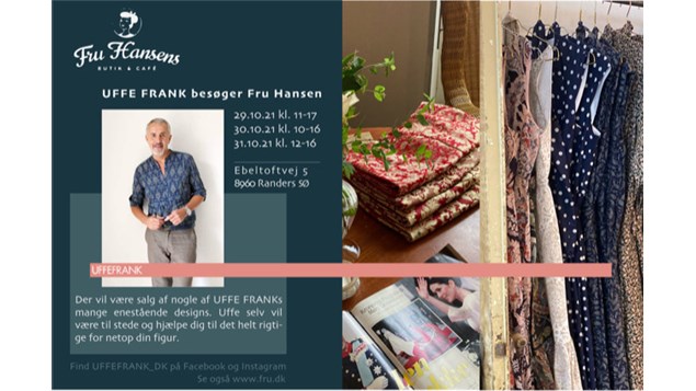 Den danske designer UFFE FRANK besøger Fru Hansens Butik & Café, Ebeltoftvej 5 i Drastrup, 8960 Randers SØ nu på fredag og hele weekenden.