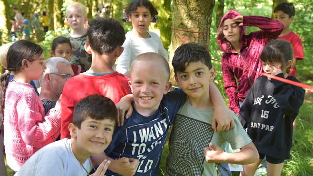 Hundredvis af små kunstværker, skabt af børnehaver og fritidshjem, blev torsdag den 16. maj 2024 samlet i et stort kunstværk, hængt op på en rød snor mellem træerne.