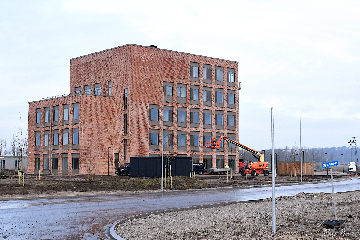 - Vi har også haft et stort fokus på klimatilpasning af udearealerne i forhold til at håndtere store mængder regn. Vi har grønne tage, hvor planter holder på og optager en del af nedbøren. I forbindelse med nedløbsrør og andre steder på grunden er der lavet render, der sørger for at vandet ledes ud i et regnvandsbassin, hvorfra noget vil løbe ud i Kristrup Engkanal og resten siver ned i jorden. På p-pladsen har vi valgt en permeabel belægning, der lader regnvandet sive ned i jorden med det samme, siger Peter Christensen.
