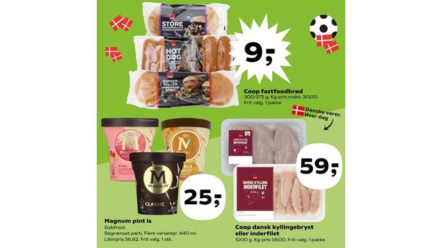 Varm op til fodboldfest med burgerboller eller hotdogbrød, dansk kyllingebryst og Magnum pint is i flere varianter til den søde tand. God fest!